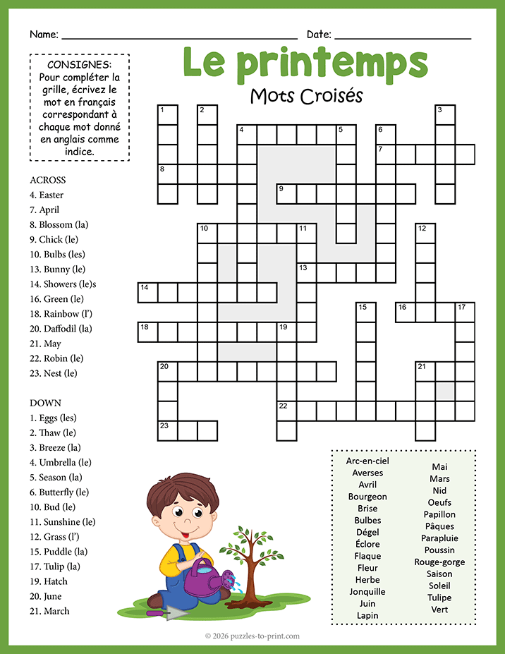 Strengthen your French vocabulary with this spring-themed crossword puzzle. The clue gives the word (and its article if appropriate) translated into English, making it a fun way to build your French language skills.