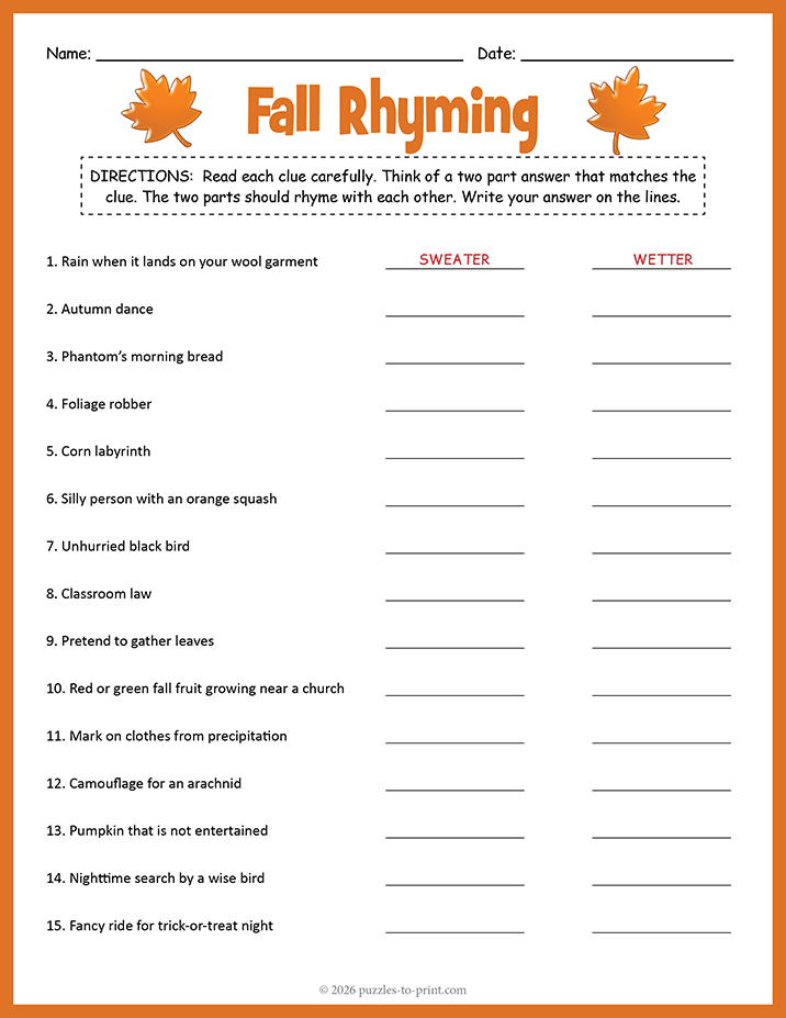 These fall hink pinks bring together the sights and sounds of autumn, from falling leaves to harvest time traditions. Each clue leads to a clever pair of rhyming words, making this a fun and slightly challenging brain teaser for all ages. It's a great seasonal activity for classrooms or cozy days at home.