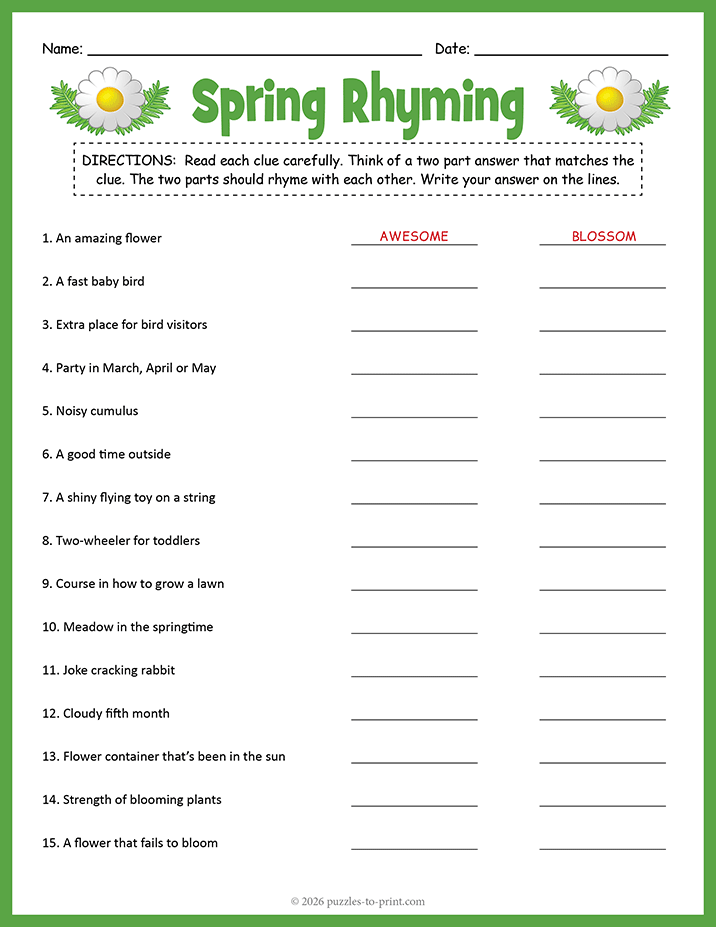 These spring hink pinks are a fun way to celebrate the season of blooming flowers, rainy days, and warmer weather. Each clue leads to a pair of rhyming words, encouraging creative thinking while building vocabulary. Perfect for kids and adults alike, this brain teaser activity is a light and engaging way to welcome spring.