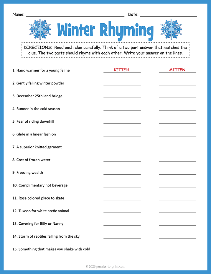 These winter hink pinks highlight the chilly charm of the season with clues about snow, ice, and holiday fun. Each riddle invites you to solve a pair of rhyming words, combining language play with seasonal themes. This activity is perfect for keeping minds engaged during the colder months.